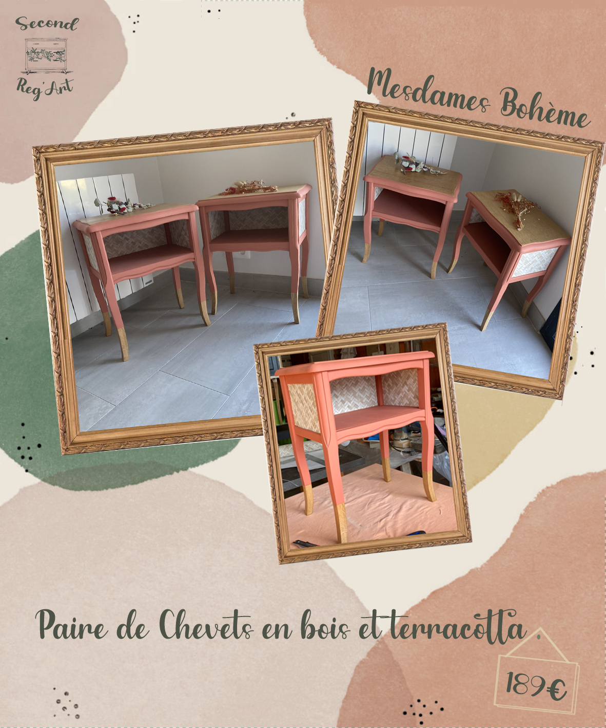 Ce duo de chevets a été peint en terracotta, agrémenté d’un papier imitation « bois tréssé », ce qui donne à ces chevets une apparence très naturelle. Ce papier a également été posé à l’intérieur de la niche, il éclaircit ainsi le renfoncement.